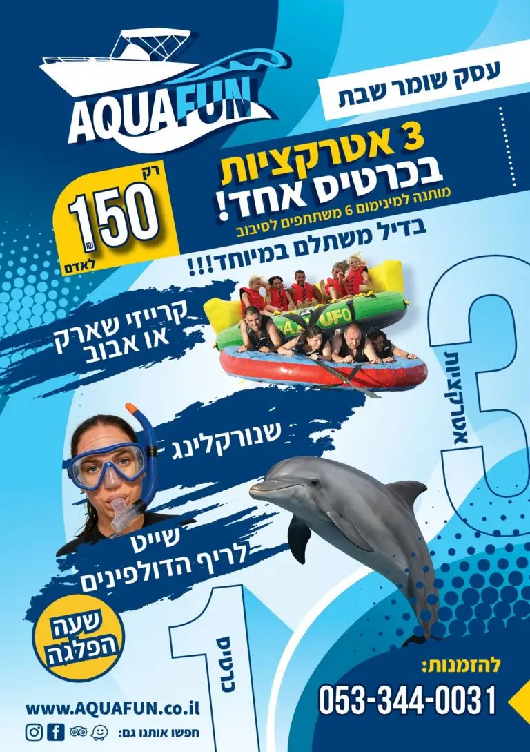 ספורט ימי באילת – אקווה-פאן ספורט ימי ואטרקציות – כל הריגושים מתחת לקורת גג אחת. ספורט ימי, סקי מים, שיעורי סקי-מים, שייט בסירת מנוע, אבוב קרייזי-שארק, אבוב שכיבה ומצנחי-ים ועוד המון פעילויות כיף באילת, ״כי אנחנו כאן בשביל הפאן״, ניתן לבצע הזמנה קבוצתית במחירים מוזלים אז למה אתם מחכים!